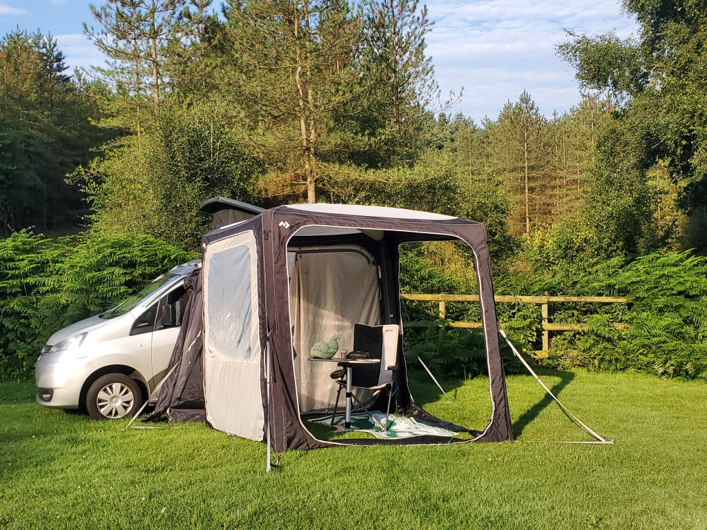 The other issue with the gravel hardstanding was that although I had mats down throughout the awning I could still feel the stones through which made kneeling down uncomfortable. I’d planned to sleep in Barry the bedroom so that I didn’t need to put my bed away each morning, but I only had a thin blanket to put over the groundsheet and below my sleeping mat. Then I had a brainwave – the bed boards from the pop up roof are cushioned. I made a little sleeping platform inside the awning and had a lovely soft surface to kneel and sit on.