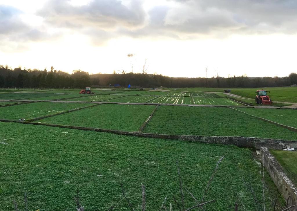 Bore holes provide chalk-filtered water from 40 feet below the surface at a constant temperature of 10° C (51° F) all year round, keeping the watercress free from frost. Apparently on a very cold day steam can be seen floating over the beds resulting from the warmer spring water meeting the frosty air.