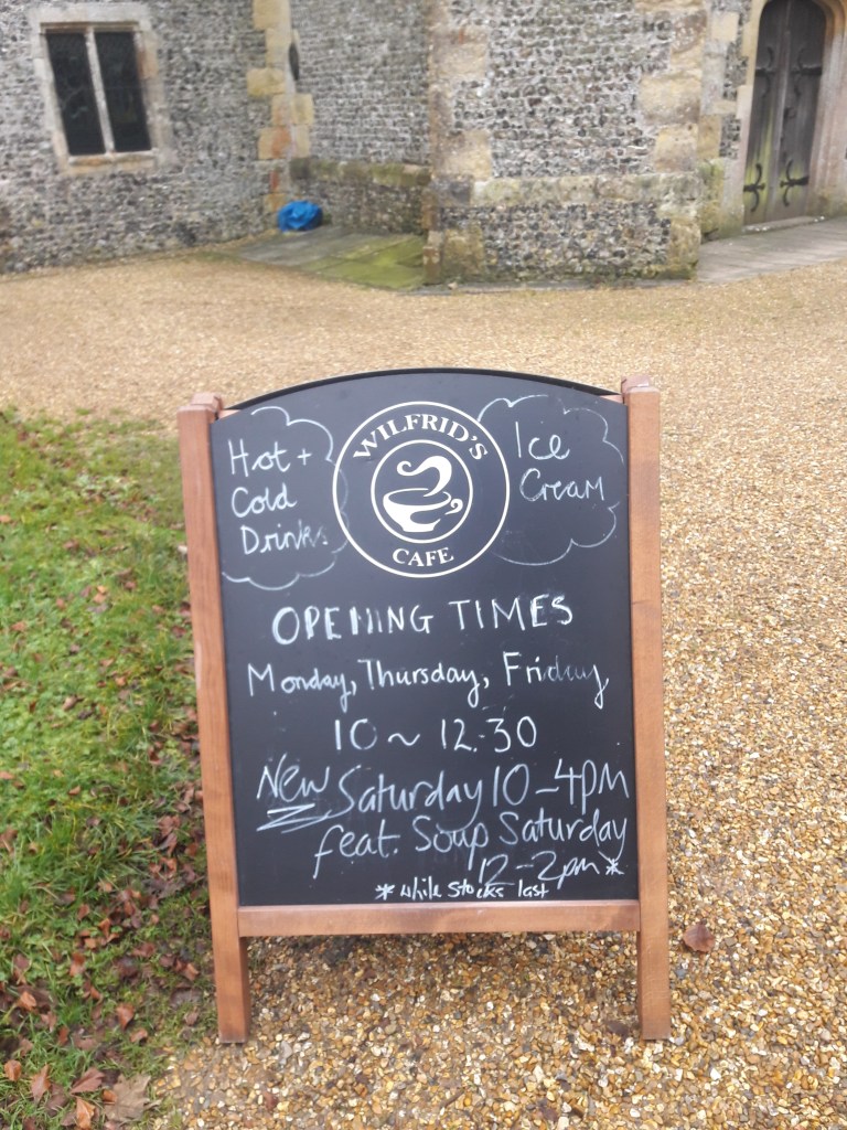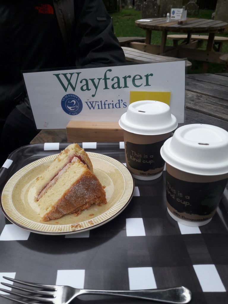 However, maybe we should have held off for another kilometre, because when we walked down into Droxford and followed the path through the church yard, we found a very welcome sight – Wilfred’s Cafe!